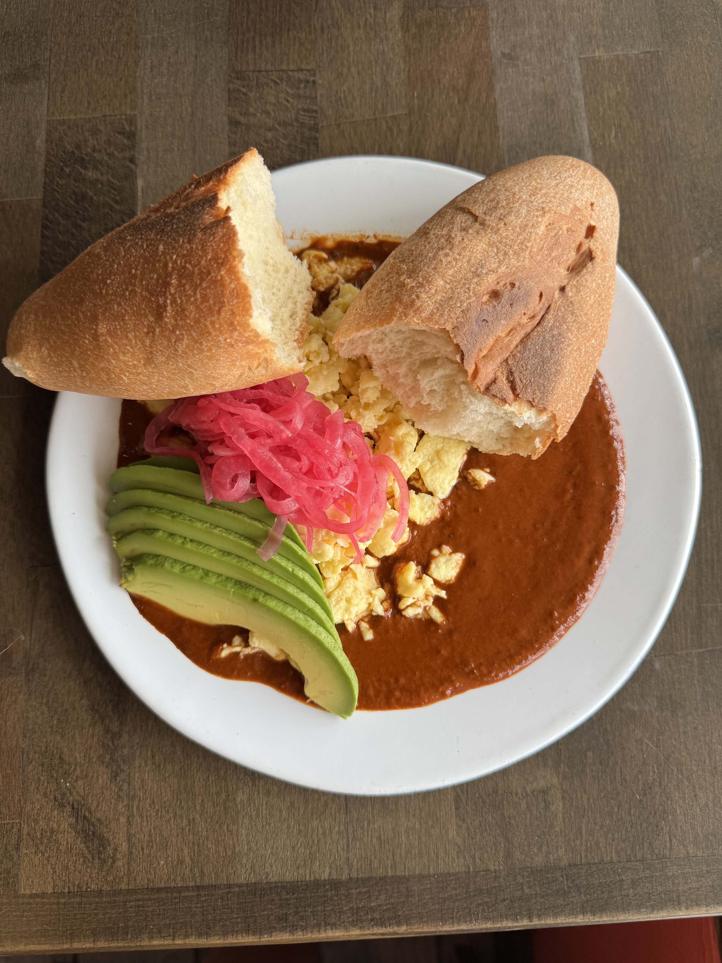 BREAKFAST MOLE PLATE - Eggs served over mole (rich and earthy chile sauce) topped with pickled red onion, avocado, and a warm bolillo (bread roll baked in house). $14.00 Add cactus & mushroom $16.00