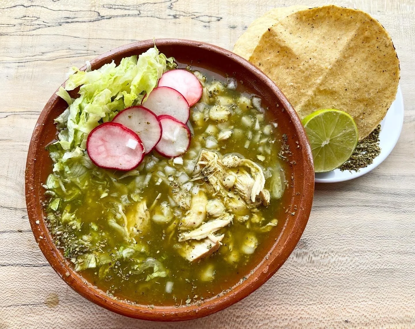 Pozole Verde - Traditional chicken soup in a chile broth with hominy. Served with tostadas, chopped onion, oregano, lime, raddish and lettuce. $16.50